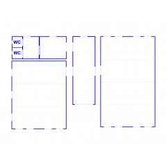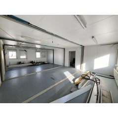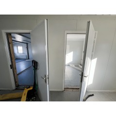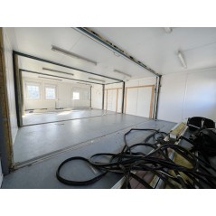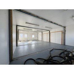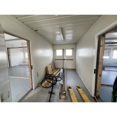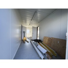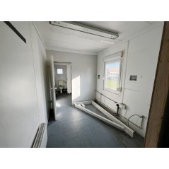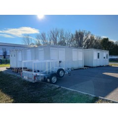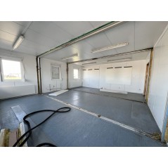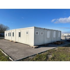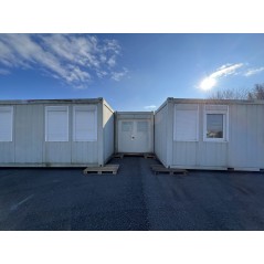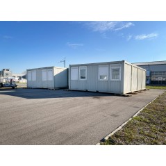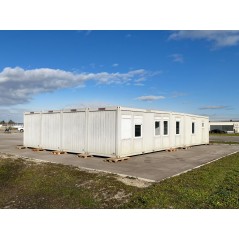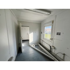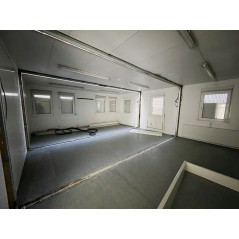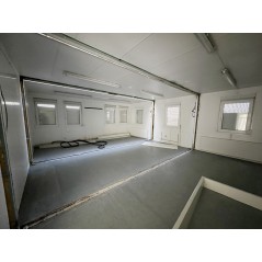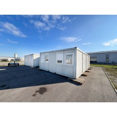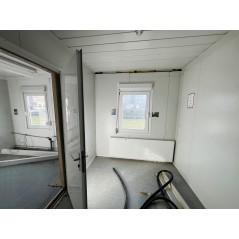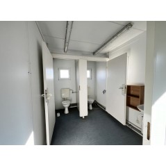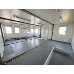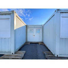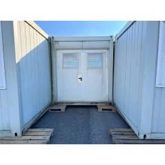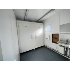 Containeranlage, abgebildete Aufstellmaße 14,55 m x 9,8 m x 2,75 m, kann individuell zusammengestellt werden. Jede der folgenden Einheiten verfügt über vollwertige Wände und könnte somit auch separat aufgestellt werden - Sanitärcontainer, Verbindungscontainer, je 2 Containereinheiten aus 3 und 4 Containern.